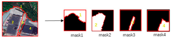 In Figure 5, we use the simple linear iterative clustering (SLIC) [39] method to perform superpixel clustering on the remote sensing image and divide images into many superpixel blocks according to spectral and textural similarity. Then, the masks are established to reflect the position of the corresponding superpixel blocks in the image.