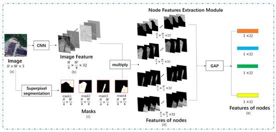 - The node feature extraction module extracts node features from the image. Inputs of this module are the original image and masks; outputs of this module are node features. First, the remote sensing image is extracted through a CNN to obtain the global feature. Then, masks are used to obtain the feature of each superpixel block. Finally, these features are passed through a global average pooling layer to obtain node features.