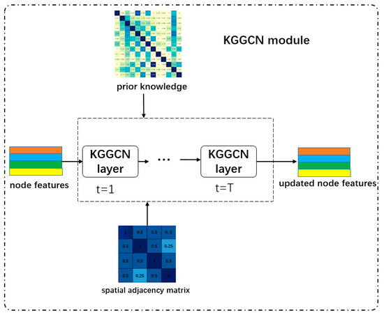 - The KGGCN Module integrates graph convolution with prior knowledge to update node features. Inputs of this module are node features, a spatial adjacency matrix, and the prior knowledge. Outputs of this module are new node features. The KGGCN Module embeds prior knowledge into graphs for feature aggregation and then updates node features.