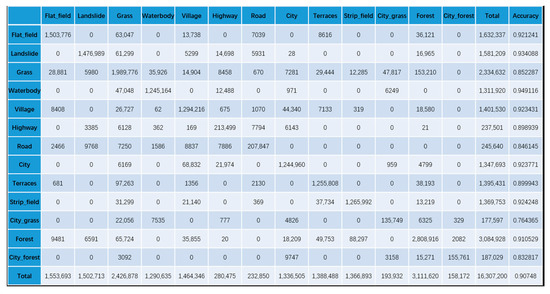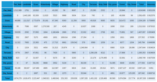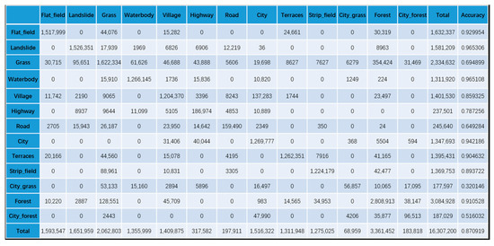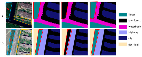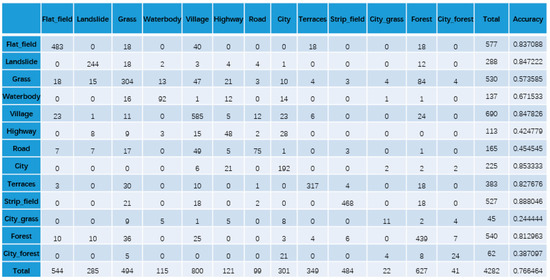 During the process of making samples, improper sample clipping may result in incomplete neighbors of some objects in the sample; then, the surrounding environment of these objects in samples might be different from the actual situation. For example, forest and city_forest are all actually composed of trees, and the difference between them is that city_forest only exists in the urban scene. Due to improper clipping, there might be a large area of urban scene around the forest. As introduced before, objects in the urban scene will have a greater impact on the forest object. Then, this will lead to misclassification. Figure 3 demonstrates some of these samples.