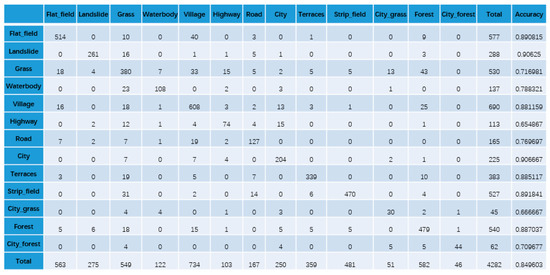 Figure 27 represents the confusion matrix of our model in test set and demonstrates the accuracy of all categories. According to Figure 27, our model is less effective in classification for a few categories, such as grass-pasture-mowed and soybean–notill. For all other categories, our model achieves good performance.