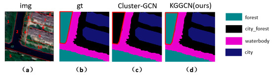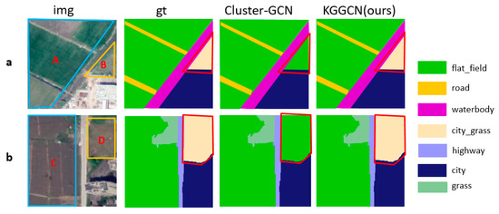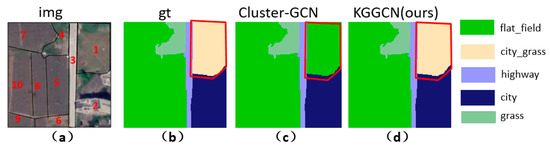 “Different objects with the same spectrum” is a common phenomenon in remote sensing images, and nodes with similar features might be classified into different categories. During aggregation of center nodes, different nodes with the same spectrum are irrevelant neighbors. If there are a large number of these neighbors, these irrevelant neighbor nodes will have a greater impact on the center nodes, so the center node can be misclassified. Figure 2 demonstrates some of these samples.