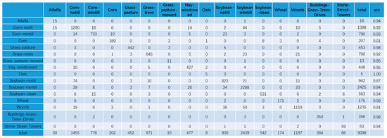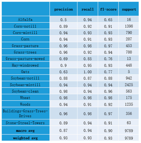 The macro avg of precision is 0.87. Precisions of alfalfa, grass-pasture-mowed, and oats are 0.5, 0.69, and 0.63, respectively, which are lower than 0.87. The reason for the poor classification effect is the small number of samples in these classes. The weighted avg of precision is 0.93. Similarly, f1-score of alfalfa, grass-pasture-mowed, and oats are 0.65, 0.76, and 0.77, respectively, which are lower than macro avg of f1-score.
