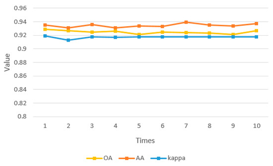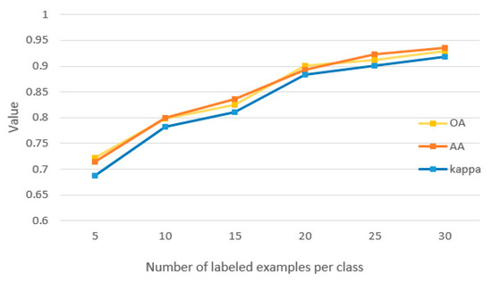 In the 10 experiments, the mean values of OA, AA, and kappa are 0.925, 0.935, and 0.918, respectively, and the standard deviations are 0.0025, 0.0024, and 0.0016, respectively. These prove that the quality and quantity of labeled training examples are reasonable in our experiments, and the experimental results are stable and reliable as well.