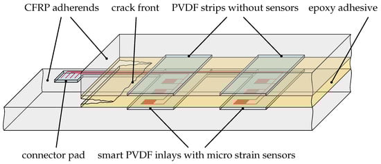 The MDAF construction consists of two PVDF strips with three micro strain sensors each, pressed into the lower adherend (strap), and two PVDF strips pressed into the upper adherend (lap), as illustrated in Figure 1. While only a single pair of PVDF strips was used in the original disbond arrest feature design [37], a second pair has been added during its evolution into a sensoric concept. The two sensor rows shall enable a differential two-point measurement of the strain inside the bondline, to be correlated to its health status. Unlike the hybrid bondline concept [5,39], the PVDF inlays do not separate the epoxy adhesive. This simplifies the positioning and bonding of the CFRP parts and will be an advantage in industrial use.