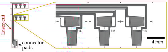 Flexible foil-based sensor systems are ideally suited for integration or application to FRP materials [6]. Next to polyimide (PI) as a substrate material, which can be preferably processed in a liquid form for subsequent sensor microfabrication [7,8,9], other substrate materials like PEN and PET foil materials have been used for flexible electronics fabrication [10]. An overview of previous substrate choices and fabrication concepts has already been provided [11], where the importance of balancing material properties like thermal expansion, elastic moduli and adhesion strength for reliable operation of systems-in-foil under mechanical bending and at varied temperatures is outlined. Flexible sensor elements can be supplemented by active microelectronic components made of thin silicon without decisively limiting the flexibility [12]. Moreover, rigid sensors can also be combined with flexible sensors, as shown by the example of a pressure sensor that allows flip-chip assembly in foil-based flexible systems to be used in harsh environments [13].
