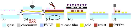 Smart inlay micro fabrication process: (a) Sputtering chromium ring with shadow mask. (b) Fixing PVDF substrate to the carrier wafer under vacuum and heat. (c) Sputtering the chromium gold layer and applying photoresist. (d) Transferring pattern by n-tone lithography. (e) Etching of metallic layers and removing resist. (f) Electroplating wires and laser cutting.