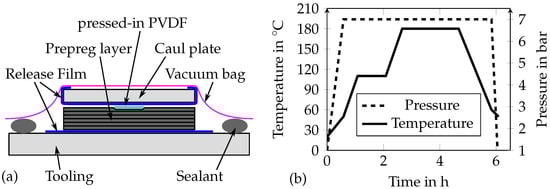 The adherends were made of 16 plies Hexply 8552/IM7 (12K) unidirectional prepreg with the stacking sequence [0/+45/90/−45/0/+45/90/−45]s. The 0 outer layer minimizes the risk of delamination failures close to the bondline (see Section 4.3). The sizes of the adherends forming the strap and lap are 390 by 350 and 240 by 350 , respectively. The smart inlays were placed in a row on the CFRP strap laminate, whereas PVDF inlays without sensors were placed on the lap. Together, the PVDF strips and the smart inlay form the MDAF, as already sketched in Figure 1. The sensor structure of the smart inlay lies at the outside and is thus electrically isolated from the CFRP prepreg by the substrate. Finally, the adherends were covered with caul plates of the same size as the adherends. The caul plates ensure a smooth surface of the adherends and that the inlays are pressed into the laminate completely. Moreover, they were wrapped into a release film, which allows demolding after the curing process. The filigree sensor structures were in direct contact to the wrapped caul plate during the curing process. Both stacks were placed on a metal tooling, which was also covered by a release film and sealed between the tooling and a vacuum bag. The co-curing setup is illustrated in Figure 6a. The adherends were cured in the temperature and pressure cycle given in Figure 6b under a vacuum of less than . After co-curing, the rough sides of the CFRP plates were cut off to obtain clean edges for the subsequent adhesive bonding process.