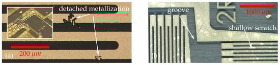 (a) Micrograph of an interrupted measuring grid after lithografic structuring on the untreated foil substrate. Insert shows picture of larger detached metallization flakes. (b) Micrograph obtained with ring light illumination allows to distinguish between function disturbing grooves and superficial scratches.