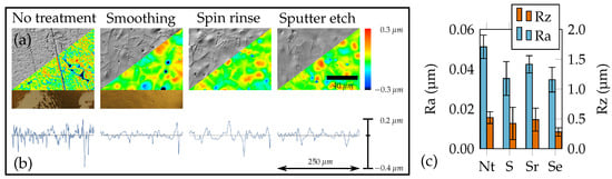 The tape peeling test as visualized in Figure 9a showed, that the adhesion after the introduction of the wafer fixation and smoothing process was already sufficient to completely prevent detachment between metallization and the fully covered substrate. Thus, the influence of localized spots of contamination with limited adhesion becomes visible only after the structuring of the filigree functional structures. This substantial improvement in substrate quality also became visible with respect to surface roughness (see Figure 9b,c). The PVDF surface with no treatment (Nt) has a fine grain structure with some rather deep grooves such that “Ra” value was the highest. After melt down during the smoothing (S) process, the surface exhibits a plain orange skin-like appearance, with some small craters where solvents have evaporated. Hence, the “Ra” value drops. After the aceton has slightly dissolved the surface in a spin rinse (Sr), grain boundaries seem to stick out more whereas craters have flattened. Sputter etching (Se) flattens the relief-like elevations such that the “Rz” value finally decreases to a value significantly smaller than for the untreated foil. In addition, the rigid carrier wafer enables simplified handling and improved micro fabrication, e.g., with regard to photoresist layer thickness homogeneity.