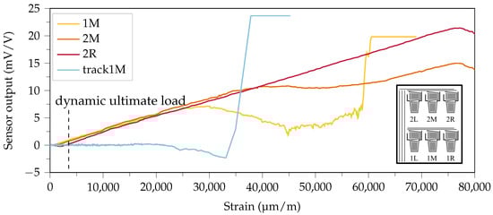 Exemplary sensor signals obtained under tensile load: First row middle sensor element (1M) was the first to deviate from the desired linear elastic characteristic. The middle element in the second row (2M) started decaying at 40,000 . The last of the six sensor elements to loose function was the right element in row two (2R). With a slightly different sample (refer to Section 3.2), the vertical conductive tracks where lengthened, while the sensor signal from sensor element 1M was logged.
