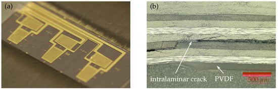 The function conformity of the MDAF with respect to adhesion, crack arrest and crack detection was investigated using CLS specimens. The smart inlays integrate well (see Figure 11a) and withstand the harsh co-curing conditions. The process works reliably with standard tools. Successful co-curing must ensure that the sensor shape is preserved and the adhesion between the CFRP plates and all inlays is better than the adhesion between the adhesive and the CFRP matrix. If any interface of the MDAF exhibits poorer adhesion than the bondline, this would be a preferred location for crack initiation and therefore counteract the desired functionality. Figure 11b illustrates the results from a preliminary adhesion test, where a CLS specimen was loaded till a complete failure of the bondline occured. The cross sectional micrograph of this sample shows, that the CFRP matrix material ruptured intralaminarily before the interface between PVDF inlay and CFRP failed. This is clear evidence for outstanding adhesion strength between the inlay and the surrounding matrix material.