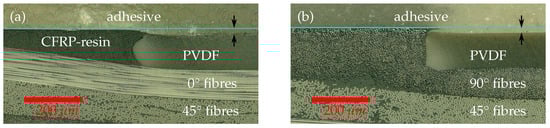 The upper ply with 0 orientation in Figure 12a yields the maximum strength at the PVDF interface in the direction of longitudinal strain whereas the strength of the 90 ply in Figure 12b under the same longitudinal load is much lower. As a result, damages in the 90 ply can be initiated much easier and at loads below the strength of the adhesive. Hence, the fracture mechanism is likely dominated by delaminations if a 90 ply is used at the interface instead of a cohesive failures in the adhesive. For that reason, 0 plys at the interface to the crack stopping polymer stripe are recommended [3,42]. In addition, the cross sectional view revealed a shrinkage step of about 25 towards the PVDF inlay, caused by different coefficients of thermal expansion between the CFRP epoxy matrix and the PVDF material.