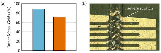 (a) Percentage of electrically intact measuring grids. About 90% of working measuring grids were obtained directly after micro fabrication on the carrier wafer (blue bar). After CFRP integration, approx. 70% of the sensor structures are intact (orange bar). (b) Damaged integrated sensor structure due to handling of co-cured plates on rough surface.