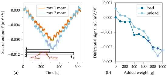 For investigating the MDAF functionality, the CLS specimen was clamped horizontally on one side, thus forming a cantilever to which weights were added at the free tip (see Figure 7b). Additional 100 weights were attached to the tip every 30 . After 10 weights, they were gradually removed again at the same rate. The signals of both sensor rows were recorded. The longitudinal strain in the CLS cantilever grows from zero at the free end to its maximum value at the fixed end. Thus, a strain gradient occured between the two sensor rows. However, the strain is expected to be rather low in the sensor array, as it is positioned near the neutral plane of the CLS specimen.