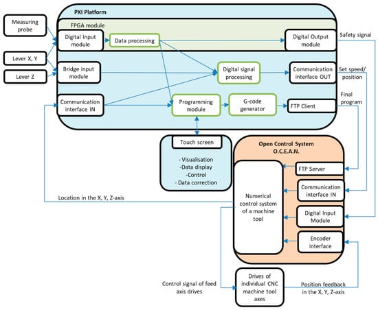 A block diagram of the designed system for manual programming of the CMGS is presented in Figure 2. The system consists of input elements (levers and a measurement probe), an input-output element (monitor supporting manual programming), a PXI platform for signal processing and final programming generation, and a CNC machine tool with a control system. The CMGS system is mounted on a three-axis milling machine of medium size of type VC760 produced by Fabryka Obrabiarek Precyzyjnych AVIA S.A. The body system of the machine is equipped with drives with circulating ball feeding screws. The machine has three axes, X and Y implementing the horizontal movement of the cross-table and Z axis implementing the headstock’s vertical movement.