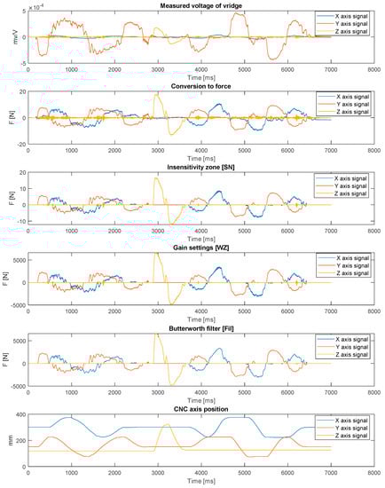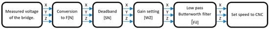 The measurement signal from strain gauge modules is digitally processed to determine the speed at which a given CNC machine tool body element is to move (Figure 5). The final speed depends on the input data to the CMGS from the O.C.E.A.N. system and on the status of the main lever buttons. The signals for the X, Y and Z axes are processed by means of an additional post-processing algorithm whose signals are depicted in Figure 6.
