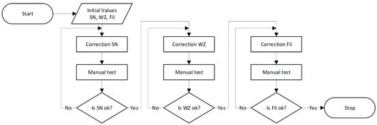 Each operator has the ability to customize the settings and insensitivity zone reinforcement parameters based on their preferences. The signal characteristics that are presented show how the positioning accuracy of a CNC machine tool changes depending on the settings used. The graphs show the selection of three parameters: low-pass filter (Fil), insensitivity zone (SN) and gain (WZ). The algorithm shown in Figure 9 has been developed to adjust the parameters.