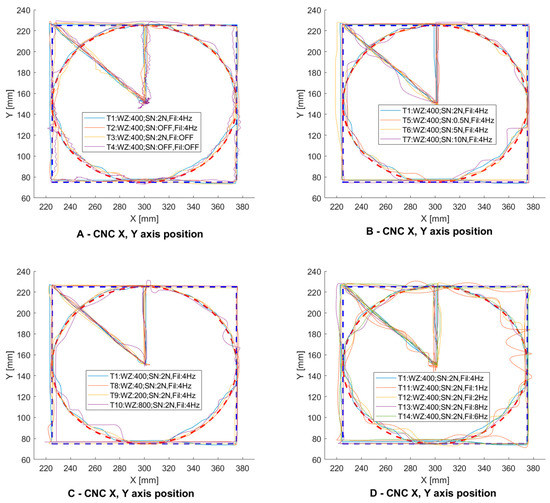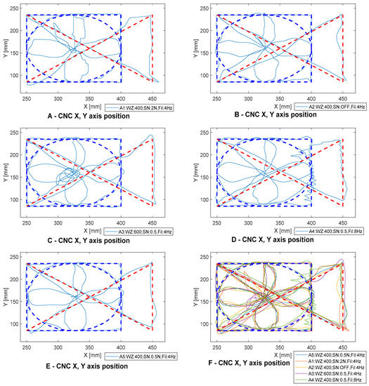 The process of selection of settings for the first operator is shown in Figure 10. First, tests were carried out on the initial settings WZ400, SN2.0 and Fil 4 Hz (Figure 10A). Then the insensitivity zone parameters were selected. Figure 10B shows the sequence with the insensitivity zone switched off. The operator selected a value of 0.5 for SN and 400 for WZ. Next, the Fil parameter was selected—Figure 10D shows its value of 8 Hz—a clear deterioration of the course is visible, which suggests that using a low-pass filter is necessary in a developed machine tool control system. Final settings preferences for the operator were WZ = 400, SN = 0.5 and Fil = 4 Hz (Figure 10E). It can be seen that the best pattern was obtained for these settings.