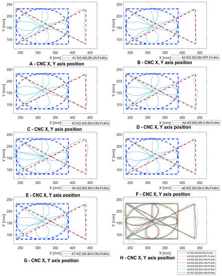 The second operator selected and used the following initial settings: WZ = 400, SN = 2.0 and Fil = 4 Hz (Figure 11A). Next, the SN parameter was selected, which is depicted in Figure 11B for the course for the switched off insensitivity zone. It can be seen that it caused a noticeable deterioration of shape reproduction on straight lines. The operator finally set the SN parameter to 0.5 (Figure 11C). In the following approaches whose results are depicted in Figure 11D,E, the gains were changed by 600 and 800, respectively. This caused a deterioration in the pattern mapping. Ultimately, the operator selected the WZ parameter to be 300, which eliminated the deterioration. Next, the different frequencies for the Fil parameter settings were examined. In the case of the second operator, the changes did not cause any significant deterioration in the mapped trajectory (Figure 11F). The preferred settings for the operator are depicted in Figure 11G and were 300 for WZ, 0.5 for SN and 6 Hz for Fil.