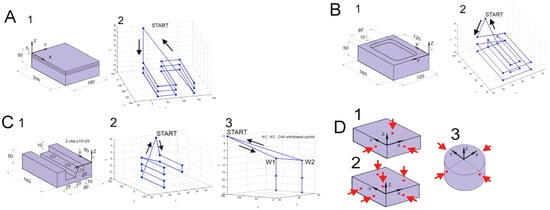 (A) Variant I of the study: 1—workpiece to be machined; 2—drawing of the designed tool path milling. (B) Variant II of the study: 1—workpiece to be machined; 2—drawing of the designed tool path milling. (C) Variant III of the study: 1—workpiece to be machined; 2—drawing of the designed tool path milling; 3—drawing of the designed tool path drilling. (D) Diagram of workpiece measurement operation: 1—measurement of workpiece position by 3 points 1/1/1 diagram—variant IV; 2—measurement of workpiece position by 6 points 3/2/1 diagram—variant V; 3—measurement of cylinder diameter by 4 points—variant VI.