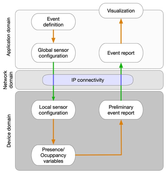 As it can be observed in Figure 1, the definition of an event generates a global configuration of Wi-Fi sensors that is used to assess the occupancy of the event environment. The event definition consists of a date, start and end time of the measurement, as well as the identification name of the event. This configuration is broadcasted to all Wi-Fi sensors involved in the assessment, and each sensor adapts its local configuration with the new received commands.