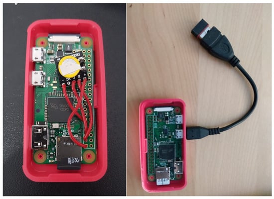 Each Wi-Fi sensor is based on a Raspberry Pi Zero W (Raspberry Pi Foundation, Cambridge, UK) single board. These boards are provided with a wireless interface and Bluetooth connectivity. In addition, an additional wireless network adapter was added (TB Ralink 5370; MediaTek Inc., Hsinchu, TW). This way, each sensor can be connected to a Wi-Fi LAN and monitor Wi-Fi probes at the same time. Finally, a modification was applied to the Raspberry equipment that aims to solve the problem identified in the study carried out in [37], which consists of the integration and use of external clocks RTC DS3231 to obtain timestamps for the data collected, avoiding data inconsistencies when being processed by the server. In this way, duplicate data are avoided, and the correlation of information captured by different sensors is facilitated. Figure 4 shows a real example of the Wi-Fi sensors implemented.