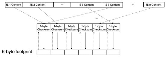 First, a 6-byte footprint is initialized to zero (00: 00: 00: 00: 00: 00). The IEs of each Wi-Fi probe are analyzed, as shown in Figure 5. Once the IEs of the Wi-Fi probe are checked (avoiding using the ESSID, since it is always present and can be highly variable due to the fact that the same device can ask for several networks in a small period of time), a mini footprint is calculated. This mini footprint is a 1-byte value calculated as the checksum of the bytes contained in the analyzed IE. For those IEs that present highly variable values between probes issued from the same device, e.g., IE_DS_PARAM or IR_EXT_CAP, the mini footprint is calculated as the code of the IE itself (0×03 for IE_DS_PARAM, 0×7F for IE_EXT_CAP, etc.). Sequentially, each time a mini footprint is obtained, its value is added to that of the content of the next byte of the footprint, and the mask 0xFF is applied to it. If the number of mini footprints is greater than 6, it begins again with the first element of the footprint, and so on. This process is summarized in Figure 6.