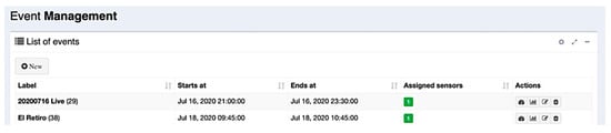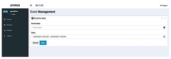 The web application allows the definition of events, the assignment of Wi-Fi sensors to events, and the visualization of results after the events finished. The web server is based on node.js [49] and its web framework, Express [50]. It also uses the SQLite database for managing the information related to events, Wi-Fi sensors, and user of the system credentials. It was developed following a RESTful approach [51]. That means that the functionality offered by the server was encapsulated into web resources and offered by a RESTful API to other components of the platform.