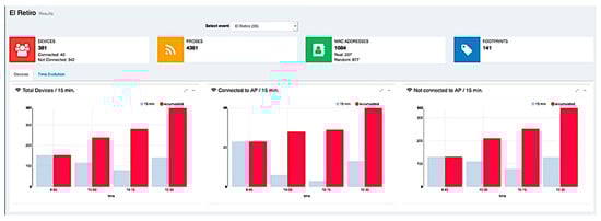 In this sense, although there exist different technologies that allow tracking or counting, this research focused on using Wi-Fi technology and smartphones. The cheapening of smartphones and their usefulness have favored their inclusion in people’s daily lives [10,11]. For our purposes, they are interesting because of the omnipresence of Wi-Fi interfaces in them. These devices allow continuous connection to the internet and offer a trail of connectivity that allows the monitoring and control of their presence. Even though this could be interpreted as a vulnerability of the people’s freedom, it has been verified that the tracking of devices in exceptional situations (pandemics, terrorist attacks, etc.) favors the safeguarding of general security [12]. In any case, through anonymization techniques, such as those carried out by non-contact sensing and tracking systems for COVID-19, it is possible to guarantee people’s privacy [13].