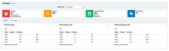 The results show that the estimates made by the system in these preliminary tests were realistic yet not as close to the observed reality as expected, pointing out that some adjustments had to be made in our system to increase its accuracy. The total number of devices is calculated as a sum between the UUI obtained from real MACs and the footprints, which, as indicated in the previous sections, are virtual identifiers obtained from the random MACs sent by the devices. In this sense, and always assuming one person per device, for the first experiment (prel_01), we had an expected number of people of 25, and the system detected 21 real MACs and 15 footprints. The deviation between the detected result and the expected one was corrected by adjusting the calculation of the 6-byte footprints. This adjustment was focused on the analysis of all IEs to determine those that varied between probes sent by the same device, e.g., IE_DS_SET or IE_EXT_CAP. Using these IEs in the calculation of the 6-byte footprint resulted in different values for the same device, overestimating the final number of people. Finally, and as explained in Section 4.1.1., for these variable IEs, we decided to use their code instead of their value.