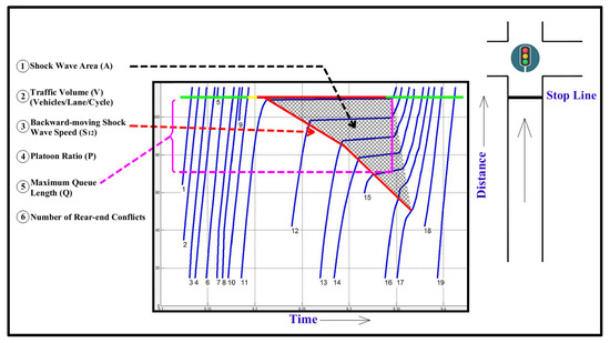 Essa et al. 2020 [48] developed several safety performance functions that can be used to quantify vehicular safety in short time intervals, which allows for traffic conflicts to be estimated at the cycle level in the ATSC context. The safety performance functions relate dynamic traffic parameters, such as shockwave characteristics and cycle parameters, to estimate traffic conflicts. The most significant parameter used was the shockwave area, which is strongly correlated with rear-end conflicts at intersections. The derived safety performance functions are as follows, with the input variables defined in Figure 1: