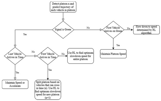 The ideal speed of a platoon of vehicles at any given point in time, , is dependent on the current state. Depending on the situations outlined in previous sections, the vehicle may be asked to speed up or slow down. While it may be possible to develop a formula using optimization that would eventually integrate into an ATSC system, this would be too computationally intensive given the large number of computations performed for every vehicle in the system. Instead, a reinforcement learning approach was used, provided that the situation warrants a slowdown. Reinforcement learning (RL) approaches are functionally similar to linear regression models with regards to their relatively low computational intensity. RL approaches are thus superior to conventional approaches in that they can easily perform actions in real-time, and that they do not require site-specific formulation to function, instead opting for a largely data-driven approach to achieve great benefits to safety.