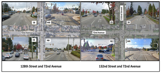 The first intersection, located on 128th Street and 72nd Avenue in Surrey, BC, is comprised of four approaches, each with two through lanes and a left turn lane at the intersection. A bus route is present on 72nd Avenue. A loop detector system, which allows for adaptive traffic signal control using left turn vehicle occupancy, was also present on all four approaches. This was considered as the main test site, representing a typical intersection. The algorithm’s performance on this intersection was considered to be representative of standard conditions for two-lane roads.