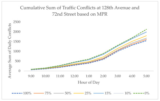 Test scenarios for the 100%, 75%, 50%, 25%, 15%, 10%, and 0% MPR scenarios were tested on 128th Street and 72nd Avenue and yielded positive results as shown in Figure 8. Similar to previous studies, the bulk of the safety benefits begin to manifest themselves when approximately a quarter of vehicles on the road are CVs, with the largest jump in conflict reduction observed between 15% and 25% MPR where 74% of the total benefits are attained. At 10% MPR, a 6% total reduction in conflicts can be observed, indicating that the system can improve safety early in the CV implementation process.