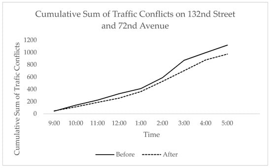 The disparity in the benefit may have been attributed to the difference in geometric characteristics of the various approaches. In order to ensure that an appropriate comparison was made, the results were filtered to only account for similar approaches (those on 72nd Avenue). As a result, a total average conflict reduction of 15% was observed, as shown in Figure 9 and Table 3.