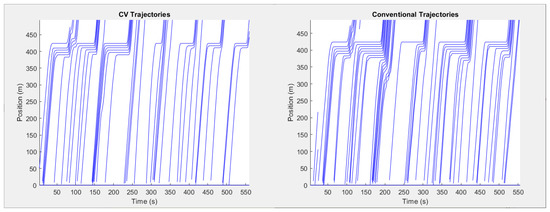The proposed algorithm demonstrated behavior that was similar to the ideal behavior previously discussed, with vehicles slowing down such that they may arrive at the intersection in time for the next green while avoiding the creation of stop-and-go waves or unnecessary delays. The space-time diagram in Figure 10 demonstrates this relationship where a smaller shockwave area was observed over eight cycles due to the algorithm’s ability to dissipate shockwaves by controlling individual vehicle speeds. It should be noted that this represents the trajectory observed on a single lane, and that lane changing behavior may influence the visualization creating the discontinuities observed in Figure 10.