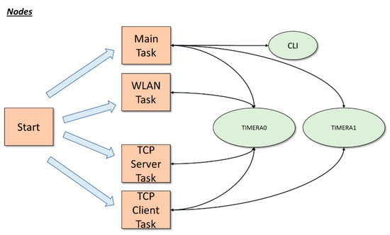 The block diagram used for the Nodes functioning is shown in Figure 2. The messages used between interrupts (TIMER_A0, TIMER_A1 and CLI) and tasks (Main, WLAN, TCP Server and TCP Client) are also indicated in the block diagram.