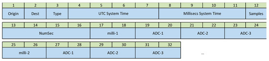 Due to the characteristics of the signal to be sampled (ambient vibrations or seismic noise), the proposed system was designed to work with a sampling frequency of 100 Hz, what it is enough for the expected frequencies. The three components of the seismic sensor were digitized through the 12-bit ADCs incorporated in the microcontroller. A minimum of 2 bytes (16 bits) is required to record each of these data. Besides, for synchronization purposes, a millisecond mark is also transmitted with the data. Thus, a constant rate of 100 samples × 4 values × 16 bit = 6.4 Kbps is the minimum payload that the protocol must assume. To be as efficient as possible, a single Ethernet frame is used to transmit a block of samples. The maximum size of the Ethernet frame is 1518 bytes, so we will transmit blocks of 100 samples (800 bytes) every second, as two seconds would exceed the maximum size and we will have to use segmentation.