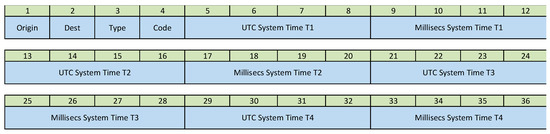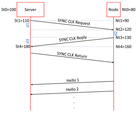 Hello messages are generated on the Nodes every 10 s and serve to notify the RPI Server that the Node and the socket are alive. Two fields TimeStamp (TS) and milliTimeStamp (mTS) are added to each Hello message to tell the RPI Server the time just before sending the packet. The TS (4 bytes) field is the time in the UTC system and the mTS (4 bytes) field corresponds to milliseconds. These messages will be an important part in maintaining the synchronization of the Nodes with respect to the RPI Server.