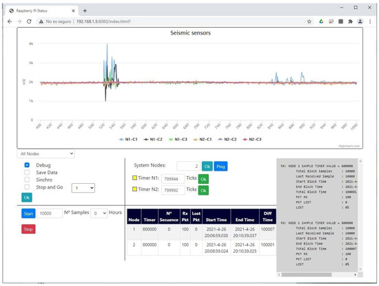 In order to monitor and record the vibrations that occur in different zones of a building in real time, a model based on the Client-Server concept was designed. The clients are implemented using a Texas Instruments (TI) CC3200 microcontroller [43] (Nodes) and the server is configured though a Raspberry Pi computer [44] (RPI Server). The system consists of several Nodes located on different floors of the building. Each Node incorporates a specially designed expansion board with a conditioning circuit [40] (page 5), which is connected to a three-component seismic sensor for the X-Y-Z axes. The Nodes are connected to the Wi-Fi on each floor where they are located and through the building’s internal local network they connect to the RPI Server via a TCP (transmission control protocol) connection. A JavaScript (JS) server was developed in the RPI Server that manages the TCP connections of the Nodes and receives the samples from each Node. Besides, the received data are saved in local files and displayed through a web user-interface.