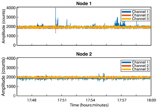 Nodes are connected to a three-component sensor through a conditioning circuit [40]. In our case, the sensor Mark-l-4C3D, with a natural frequency of 1 Hz, was used. The conditioning circuit is connected to the three inputs of the ADC1, ADC2 and ADC3 to sample each of the three components. When a Node receives a START-SAMPLING packet, the Timer_A0 is activated and triggers every 10 ms. In the interrupt routine, the first thing that is done is to read the value in milliseconds of the TimeStamp (i.e., MilliTimeStamp, mTS) carried by the Node through Timer_A1 and then the values of the three ADCs are read. These four values (mTS, ADC1, ADC2, ADC3) are stored in a buffer and the counters in charge of controlling the number of total samples (numtotalsamples) and the number of samples per packet (countsamplespkt) are incremented. When 100 samples are taken, that is, every second, the MSG_SEND_PKT_TCP event is sent to the ClientTask to generate the packet with the 400 values (mTS, ADC1, ADC2, ADC3) and send it to the RPI Server. The inclusion of the mTS information in each packet helps to verify that the sample rate remains stable throughout time. In order to know if the sampling of the signal might generate any type of congestion in the resources of the microcontroller, the duration of the sampling routine was measured. The results show that every 10 ms (sampling period), the routine spends 4 ns in the data acquisition. Therefore, the performance of the other tasks carried out by the Nodes is guaranteed.