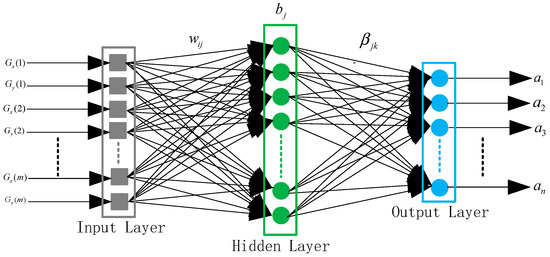 According to Figure 3, the variable wij is defined as the connection weights between the i-th neuron of the input layer and the j-th neuron of the hidden layer. bj is defined as the threshold of the j-th neuron of the hidden layer, and βjk is defined as the connection weights between the j-th neuron of the hidden layer and the k-th neuron of the output layer. The neural network structure of the ELM model is mathematically modeled as [23]