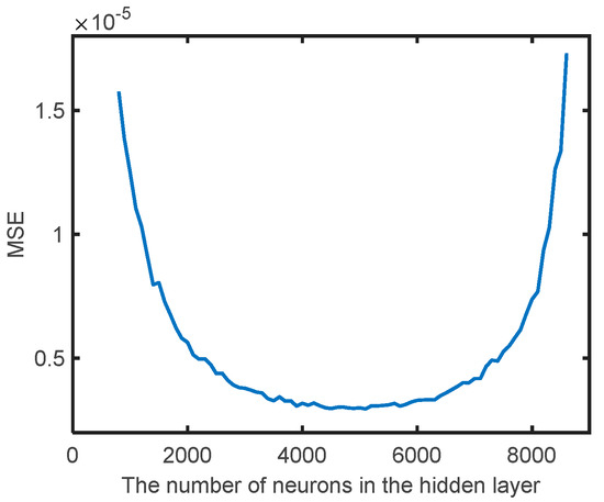 In order to determine the number of neurons in the hidden layer, the mean MSE value of 1000 test samples under a different number of neurons is shown in Figure 4. With the increasing number of neurons in the hidden layer, the predictive accuracy of the ELM model increases first and then decreases. The highest predictive accuracy of the ELM model can be obtained when the number of neurons in the hidden layer is 5100.