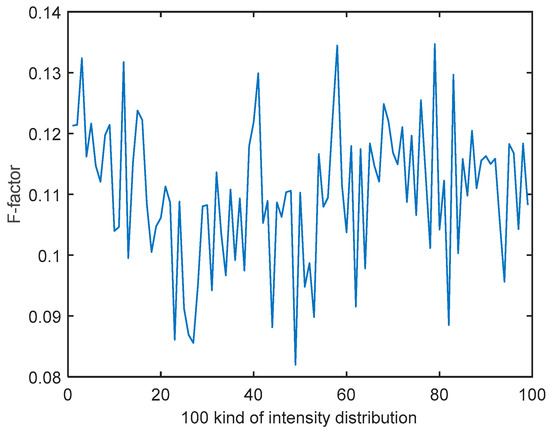 where Imean represents the mean value of intensity distribution, and Imax represents the maximum value of intensity distribution. F-factor of 100 kinds of intensity distribution is shown in Figure 5. There is little relevant literature or theory for reference about what intensity distribution variation so that WFS does not work properly. According to the statistical characteristics of intensity distribution, it is difficult to detect accurate wavefront aberrations for WFS in this paper when F-factor is less than 0.1347.