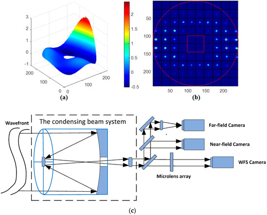 (a) Random wavefront phase distribution, (b) the sub-aperture light spot image of WFS, (c) WFS with the Cassegrain structure.