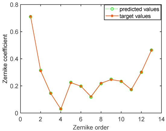 Then we employ the trained ELM model to predict Zernike mode coefficients of the generated random wavefront, as shown in Figure 6. The condensing beam system of WFS is the Cassegrain structure, and the incident aperture is annular, as shown in Figure 6b,c. In the current sample, it can be obviously seen that WFS cannot fully detect the random wavefront aberration, and some sub-apertures have no light spot or weak intensity light spot. Figure 7 shows that the predicted result of the ELM model. When the intensity of the incident wavefront is non-uniform, the ELM model can predict the accurate Zernike mode coefficients. The MSE is 3.0718 × 10−6.
