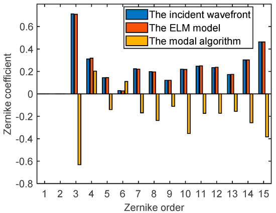 The generated random wavefront in Figure 6 is restored by Zernike modes coefficients which are obtained from the classical modal algorithm and the trained ELM model, respectively. The restored wavefront and residual wavefront are shown in Figure 8, respectively. According to Figure 8, the root mean square (RMS) and peak-valley value (PV) of the residual wavefront of the ELM model are 0.0011λ and 0.0096λ, respectively. The RMS and PV of the residual wavefront of the modal algorithm are 0.3673λ and 3.3673λ, respectively. Through the wavefront restoration comparison of the two methods, the ELM model has smaller RMS and PV of the residual wavefront and higher wavefront restoration accuracy. The first 15 order Zernike coefficients, respectively, predicted (excluding the first two order: Piston a1 and tilt a2) by the classical modal algorithm and the trained ELM model are shown in Figure 9. The prediction result of the proposed ELM model is significantly more accurate than the modal algorithm, according to Figure 9. There is a big discrepancy between Zernike coefficients obtained by the classical modal algorithm and the target values in Figure 9. The main reason is that the wavefront phase information detected by WFS is insufficient and inaccurate under the non-uniform intensity distribution.