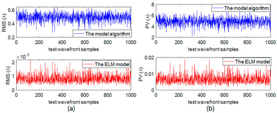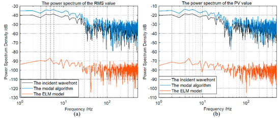 To further study the generalization of the ELM model, we use all the different light intensity distributions to expand the number of test samples to 1000 sets of wavefronts with the dynamic non-uniform intensity. The mean RMS and PV values of the incident wavefronts are 0.2831λ and 2.8501λ, respectively. The RMS and PV values of the residual wavefront of these two methods are shown in Figure 10. The mean RMS and PV values of the residual wavefront of the ELM model are 0.0082λ and 0.0066λ, respectively, while that of the modal algorithm are 0.4396λ and 4.8990λ, respectively. According to Figure 11, the RMS and PV power spectrum curve of the residual wavefront, based on the ELM model, is obviously smaller than the modal algorithm. Therefore, compared with the modal algorithm, the proposed ELM model can achieve much higher precision wavefront restoration under the dynamic non-uniform intensity distribution.