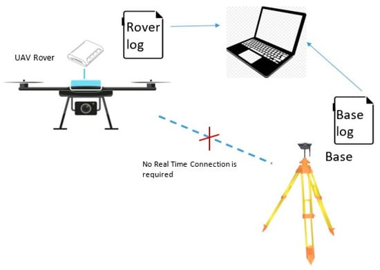 This is a very important factor to consider when you investigate places that are not easily accessible. In this case, it is possible to exploit all the potential of the PPK, which allows acquiring the raw GNSS data of the Rover on UAV (Rover log) and of a base (Base log), and processing them comfortably in a second phase. The possible configuration of this acquisition mode is shown in Figure 3.